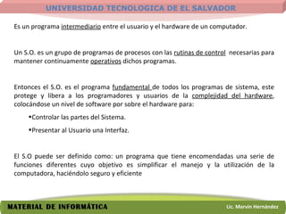 El sistema operativo es un programa que se ejecuta entre el usuario y el hardware de la computadora. Administra los recursos del hardware y asignalos a los programas de usuario. Tiene la función de proporcionar un entorno en el cual el usuario pueda ejecutar programas de manera cómoda y eficiente, protegiendo a los usuarios y programadores de la complejidad del hardware.