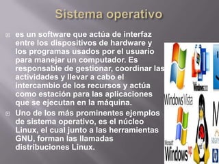 Este documento describe los diferentes tipos de sistemas operativos, incluyendo DOS, Windows 3.1, Windows 95, Windows NT, OS/2, Mac OS y UNIX. También discute brevemente la historia de Windows y Linux, desde sus primeras versiones hasta su dominio actual del mercado de sistemas operativos para computadoras personales.