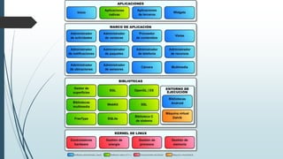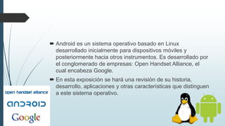 Este documento describe la historia y características del sistema operativo Android. Resume que Android fue desarrollado inicialmente por Android Inc. en 2003 y luego adquirida por Google en 2005, lanzándose la primera versión de Android en 2008. Explica que Android está basado en el kernel de Linux y tiene una arquitectura de cuatro capas que incluyen el kernel, bibliotecas, marco de aplicaciones y aplicaciones.