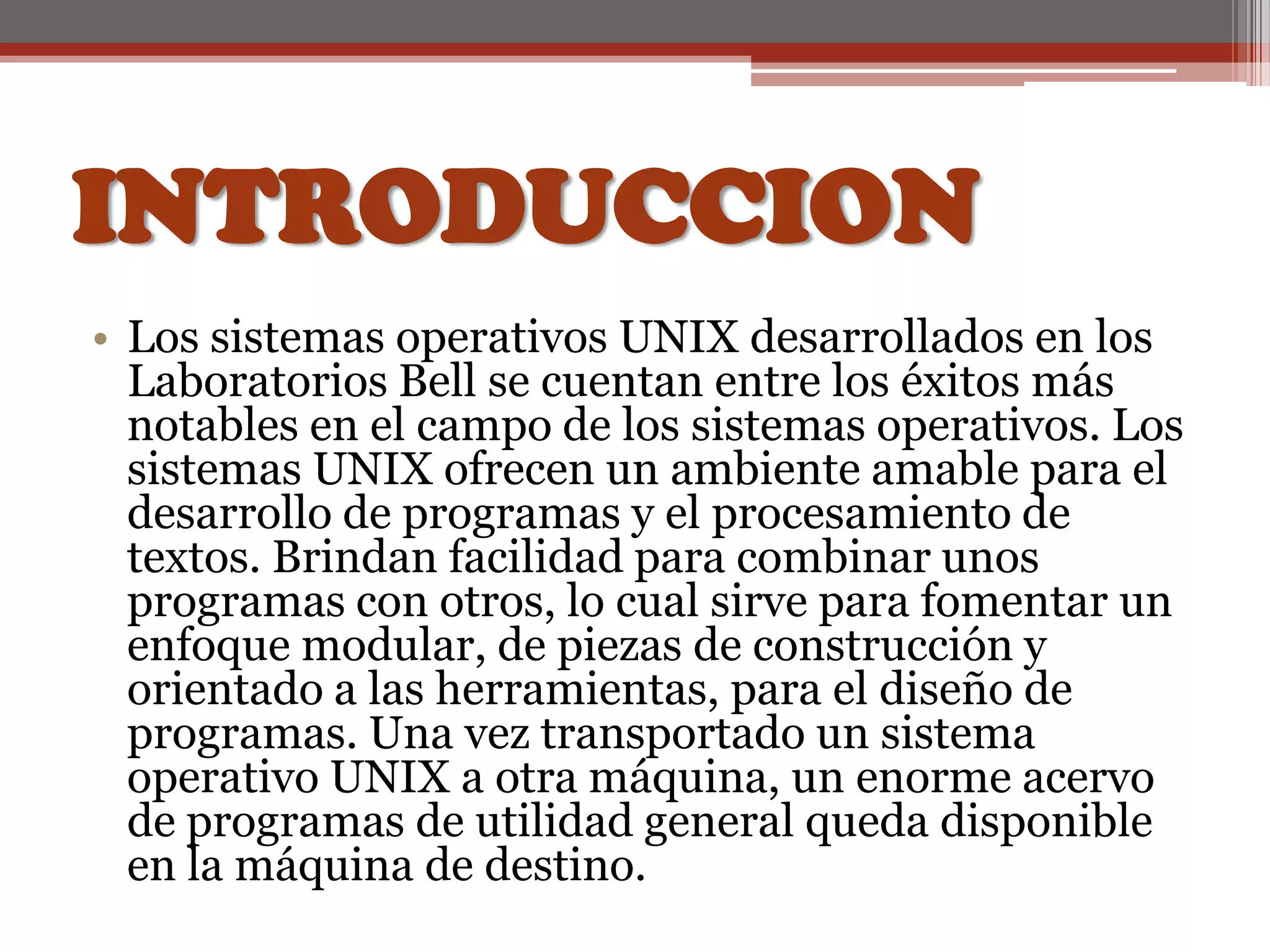 Este documento describe la historia y características del sistema operativo UNIX. Comenzó como un proyecto en los Laboratorios Bell en 1969 para crear un sistema más pequeño que el complejo Multics. En 1970 se acuñó el nombre "UNIX". Aunque inicialmente era un sistema pequeño con pocos recursos, se popularizó en universidades y evolucionó para incluir interfaces gráficas de usuario y soporte para computadoras personales. Eventualmente fue adoptado por muchos fabricantes y se convirtió en un sistema operativo líder.