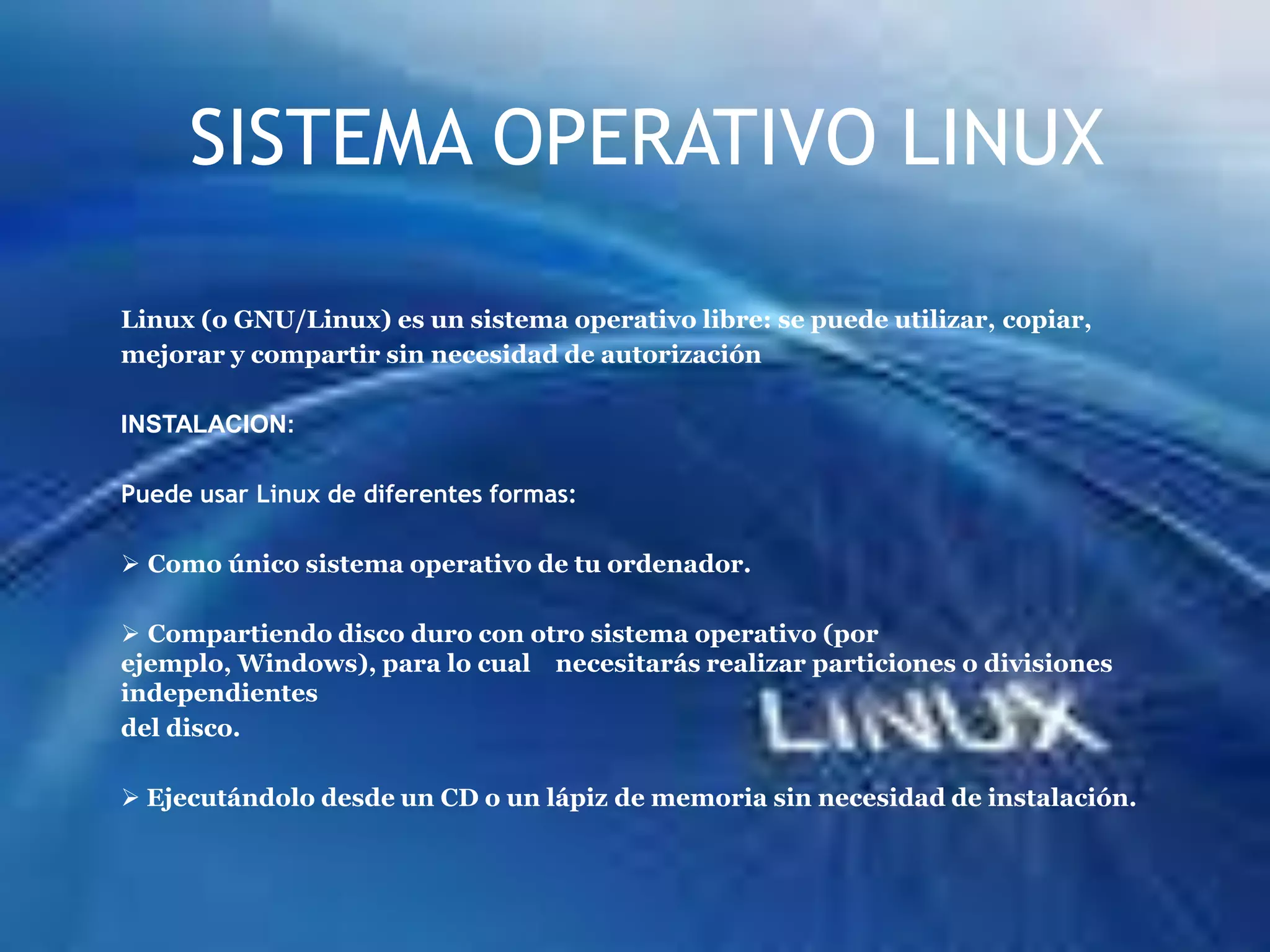 El documento proporciona información sobre el sistema operativo Linux. Linux es un sistema operativo libre que se puede usar, copiar, mejorar y compartir sin necesidad de permiso. Se puede instalar como sistema único, compartir con otro sistema operativo, o ejecutar desde un CD o memoria USB sin instalación. Incluye aplicaciones de ofimática de código abierto como OpenOffice y programas de diseño como Gimp y QCad.