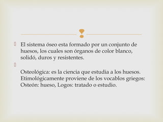 El esqueleto humano está formado por 207 huesos que se distribuyen en la columna vertebral, el tórax formado por las costillas y el esternón, y la cabeza formada por los huesos de la cara y el cráneo. Los huesos son órganos duros y resistentes que junto con los músculos permiten mantener la postura del cuerpo y realizar movimientos.
