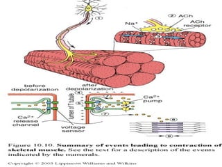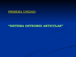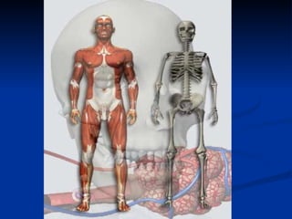 El documento resume la evolución del sistema osteomioarticular en los organismos vivos, desde las primeras células capaces de contraerse hasta el complejo sistema presente en los humanos. Explica que los huesos, músculos y articulaciones trabajan de forma coordinada para producir el movimiento, controlado por los sistemas nervioso y endocrino. Además, describe las principales características de los huesos, músculos y articulaciones que componen el sistema locomotor humano.