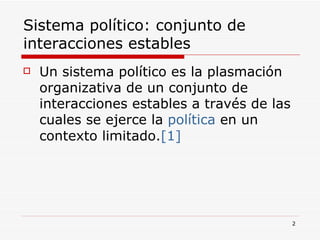 El documento define el sistema político como el conjunto de interacciones estables a través de las cuales se ejerce la política en un contexto limitado. Surge de la aplicación de la teoría de sistemas general a la ciencia política, proponiendo al sistema político como una nueva unidad de análisis. Se refiere a la interdependencia y procesos de toma de decisiones de los actores políticos, diferenciándose de otros conceptos como forma de gobierno u Estado.