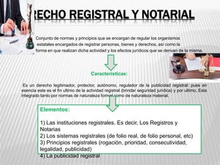 Este documento describe el sistema registral español. Se caracteriza por recoger el principio de inoponibilidad de los actos no inscritos del sistema latino, así como el principio de exactitud registral a favor del adquirente protegido del sistema alemán. De esta forma, el sistema registral español es un sistema mixto que incorpora elementos de los sistemas latinos y germánicos.