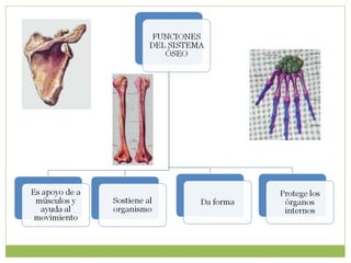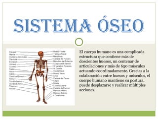 El documento describe el sistema óseo humano, que contiene más de 200 huesos que trabajan junto con los músculos para permitir el movimiento y mantener la postura. Los huesos están formados por sustancias como la osteína y sales minerales que los hacen duros pero vivos y que se renuevan constantemente. La columna vertebral, las costillas y el cráneo son algunas de las partes óseas clave descritas.