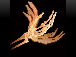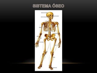 El documento describe las funciones y características del esqueleto humano. El esqueleto está formado por 206 huesos que protegen órganos internos, sirven de punto de inserción para los músculos y almacenan minerales. Los huesos se unen mediante ligamentos y articulaciones para permitir el movimiento. El esqueleto cumple funciones vitales como dar forma y soporte al cuerpo, proteger órganos, y permitir la movilidad.