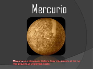 El documento describe brevemente los planetas del Sistema Solar, incluyendo Mercurio, Venus, la Tierra, Marte, Júpiter, Saturno, Urano, Neptuno y Plutón. Se proporciona información sobre el tamaño, la composición y la ubicación de cada planeta en relación con el Sol.