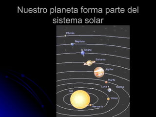 El documento describe el sistema solar, incluyendo que el sol es la estrella central alrededor de la cual giran 9 planetas, algunos con satélites como la Luna alrededor de la Tierra. Explica brevemente las características de cada planeta, como la temperatura extrema en Mercurio y Venus, la presencia de vida en la Tierra, el color rojo de Marte, el tamaño de Júpiter y los anillos de Saturno, Urano y Neptuno.