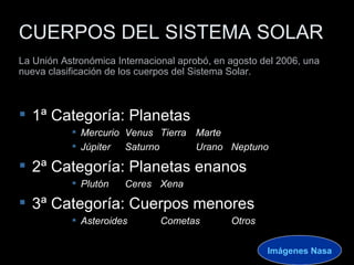 El documento presenta una clasificación actualizada de los cuerpos del sistema solar aprobada en 2006, dividiéndolos en tres categorías: planetas, planetas enanos y cuerpos menores. Describe brevemente cada uno de los 8 planetas principales - Mercurio, Venus, Tierra, Marte, Júpiter, Saturno, Urano y Neptuno - resaltando algunas de sus características físicas y orbitales clave. También menciona los tres planetas enanos actualmente reconocidos: Plutón, Eris y Ceres.