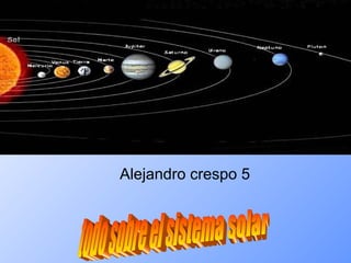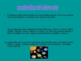 El Sistema Solar está formado por el Sol y los planetas que giran a su alrededor, incluyendo la Tierra. Nueve planetas y otros objetos como asteroides y cometas orbitan el Sol. La Tierra gira sobre su eje y orbita el Sol, causando el día, la noche y los cambios de estaciones.