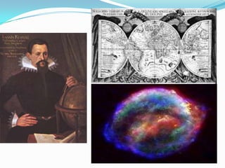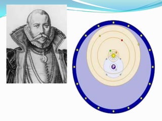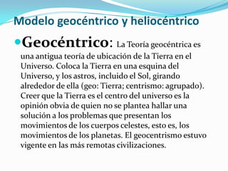 El documento resume las teorías geocéntrica y heliocéntrica sobre el modelo del universo, así como los descubrimientos de figuras clave como Tycho Brahe, Kepler y Newton. También describe los componentes del Sistema Solar como planetas, satélites naturales, y la formación y evolución del mismo a partir de una nube molecular.