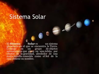 El Sistema Solar consiste en un grupo de objetos astronómicos que giran alrededor del Sol, incluyendo 8 planetas y varios planetas enanos. Se formó hace aproximadamente 4,600 millones de años a partir de una nube de gas y polvo. La mayor parte de su masa se concentra en el Sol y los 8 planetas giran casi en el mismo plano alrededor del Sol a distancias crecientes.