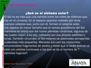 El sistema solar está formado por el sol y nueve planetas, incluyendo la Tierra, que es el único con condiciones para la vida. Cada planeta tiene características únicas, como Mercurio sin atmósfera, Venus con un fuerte efecto invernadero, Marte con su color rojizo y geografía, Júpiter como el más grande, Saturno famoso por sus anillos, Urano con su inclinación peculiar y Neptuno como el más lejano con vientos intensos. Además, se describen sus atmosféras, satélites y otras formaciones geológicas importantes.