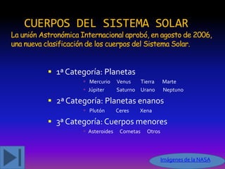El documento describe los cuerpos del sistema solar, incluyendo 8 planetas, 3 planetas enanos y asteroides y cometas. Los 8 planetas son Mercurio, Venus, Tierra, Marte, Júpiter, Saturno, Urano y Neptuno. Los 3 planetas enanos son Plutón, Eris y Ceres. Se proporcionan detalles breves sobre las características y composiciones de cada planeta.