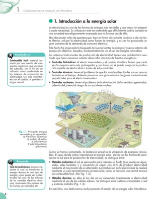 Este documento describe los componentes principales de una instalación solar fotovoltaica. Explica que las instalaciones se pueden clasificar como autónomas o conectadas a la red, e identifica los usos comunes de cada tipo como telecomunicaciones, electrificación rural, bombeo de agua y centrales solares. También describe los paneles solares, baterías, inversores y reguladores como los componentes clave de una instalación solar fotovoltaica.