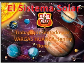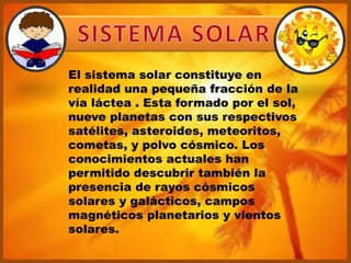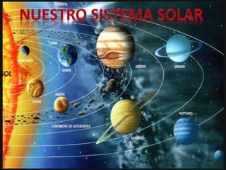 El documento proporciona información sobre los componentes del sistema solar, incluyendo el sol, los planetas (terrestres y gigantes), sus satélites, asteroides, meteoritos y cometas. Describe las características generales de estos cuerpos celestes, como sus órbitas, tamaños, distancias y descubridores.