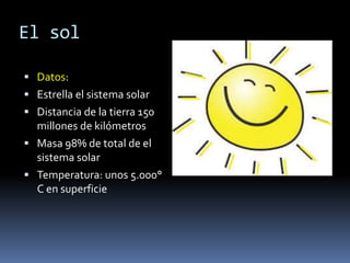 El documento presenta el sistema solar. Describe al sol como la estrella central del sistema y proporciona datos sobre su temperatura y tamaño. Luego describe los diferentes planetas, dividiéndolos en planetas rocosos como Mercurio, Venus, Tierra y Marte, y planetas gaseosos como Júpiter, Saturno, Urano y Neptuno. Para cada planeta, brinda información sobre sus características físicas y climáticas.