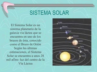 El sistema solar, ubicado en la galaxia Vía Láctea, se compone del sol y ocho planetas que orbitan a su alrededor, siendo la Tierra el tercero desde el sol. Cada planeta presenta características distintas, como la composición rocosa de Mercurio y Marte y la naturaleza gaseosa de Júpiter, Saturno, Urano y Neptuno. El sol, una estrella tipo G2, es la principal fuente de energía del sistema y determina la duración del día en los planetas a través de sus movimientos de rotación y translación.