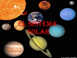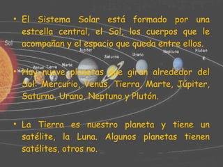 El documento describe los nueve planetas del Sistema Solar - Mercurio, Venus, Tierra, Marte, Júpiter, Saturno, Urano, Neptuno y Plutón - y proporciona algunos detalles clave sobre cada uno, como su tamaño, distancia al Sol, características físicas y, en algunos casos, satélites. Explica que la Tierra tiene un satélite, la Luna, y que otros planetas como Júpiter y Saturno también tienen satélites.