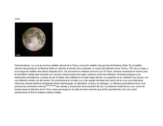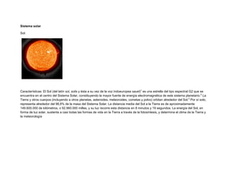 El documento describe los principales cuerpos del sistema solar. El Sol es una estrella alrededor de la cual orbitan los planetas, incluyendo la Tierra. La Luna es el único satélite natural de la Tierra. Los planetas interiores son pequeños y rocosos, mientras que los planetas exteriores son enormes y gaseosos, algunos con anillos prominentes. Cada planeta se describe brevemente con sus características clave como tamaño, distancia al Sol y temperatura.