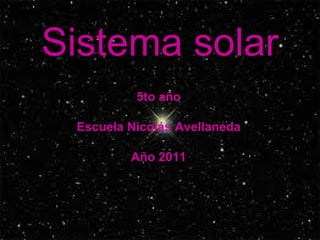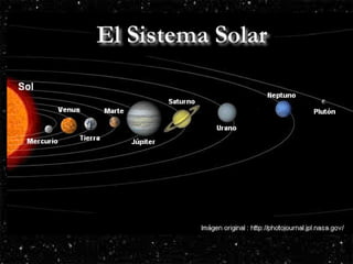 El documento resume el sistema solar, incluyendo el Sol y los 8 planetas (Mercurio, Venus, Tierra, Marte, Júpiter, Saturno, Urano y Neptuno). Describe brevemente cada planeta y sus características principales, como su tamaño, composición y órbita. También menciona que Plutón ya no es considerado un planeta.