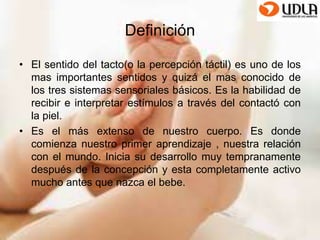 El documento detalla la importancia del sentido del tacto, que es fundamental para la percepción del mundo y se desarrolla tempranamente. Describe las características de los receptores sensoriales, incluyendo mecanoreceptores, nociceptores y termoreceptores, así como sus funciones y ubicaciones. Además, se explican las vías nerviosas relacionadas con la transmisión de información sensorial al sistema nervioso central.