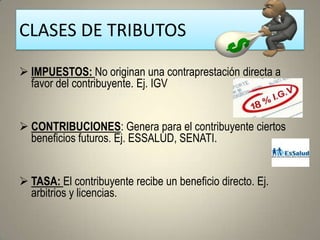El sistema tributario se compone de instituciones, normas y principios que permiten al Estado recaudar recursos de los ciudadanos a través de impuestos, contribuciones y tasas. Estos tributos se clasifican en impuestos, que no generan beneficios directos; contribuciones, que brindan beneficios futuros; y tasas, que otorgan un beneficio directo. La SUNAT administra y fiscaliza la recaudación de tributos internos para el Estado.