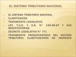 El documento describe el sistema tributario nacional peruano. Explica que está compuesto por impuestos, contribuciones y tasas que son regulados por el Decreto Legislativo No. 771. Este decreto clasifica los tributos en cuatro grupos: para el gobierno nacional, regional, local y otras instituciones. Además, el documento explica que la clasificación de los recursos públicos según su fuente de recaudación son las rentas originarias y los recursos derivados.