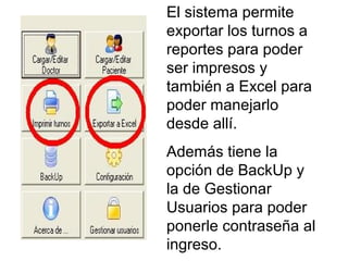 El sistema permite exportar los turnos a reportes para imprimirlos o a Excel para editarlos. Además, incluye la opción de realizar copias de seguridad y gestionar usuarios asignando contraseñas para el ingreso.