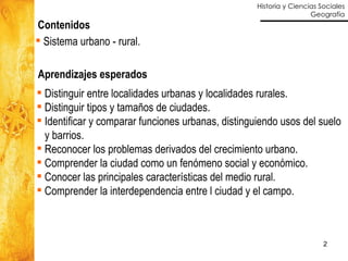 Este documento describe los conceptos básicos de sistemas urbanos y rurales. Explica cómo se clasifican los asentamientos humanos en Chile entre localidades urbanas y rurales según su población y actividades económicas. También describe las características de las ciudades y localidades rurales, incluyendo su morfología, jerarquía y funciones. Finalmente, explica la dependencia entre áreas urbanas y rurales y los factores que influyen en el proceso de urbanización.