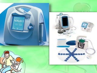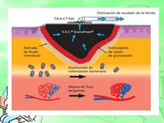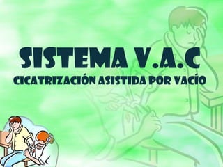 El documento proporciona información sobre el sistema V.A.C. (Vacuum Assisted Closure), el cual utiliza presión negativa para promover la cicatrización de heridas. Explica que aplica succión controlada a un apósito de espuma para eliminar exudado, promover la granulación y proporcionar un ambiente húmedo propicio para la curación. Luego detalla los componentes del sistema, sus mecanismos de acción, indicaciones y contraindicaciones para el tratamiento de diferentes tipos de heridas.