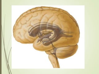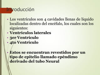 1) Los ventrículos son cavidades llenas de líquido cefalorraquídeo localizadas dentro del encéfalo. Incluyen los ventrículos laterales, tercer ventrículo y cuarto ventrículo.