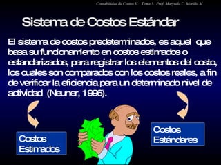 1) El documento habla sobre los sistemas de costos estándar, los cuales establecen costos estimados para registrar y comparar los elementos reales del costo.