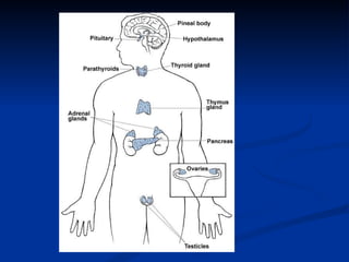 El documento describe la anatomía y función del sistema endocrino. El sistema endocrino está compuesto de glándulas que secretan hormonas que regulan procesos vitales como el metabolismo, crecimiento, desarrollo y reproducción. Las principales glándulas endocrinas son la hipófisis, tiroides, paratiroides, páncreas, suprarrenales, testículos/ovarios e hipotálamo.