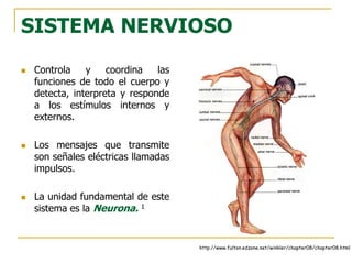 El sistema nervioso controla y coordina las funciones del cuerpo transmitiendo señales eléctricas llamadas impulsos nerviosos. Está formado por el sistema nervioso central (encéfalo y médula espinal) y el sistema nervioso periférico. El sistema nervioso central recibe, procesa e interpreta la información y coordina las respuestas, mientras que el sistema nervioso periférico transmite las señales entre el sistema nervioso central y el resto del cuerpo. La unidad básica del sistema nervioso es la neurona,