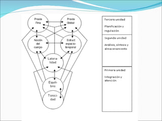 El documento describe los componentes de un sistema psicomotor total compuesto de subsistemas como el reflejo, movimiento voluntario y automático. Explora conceptos como la conciencia corporal, esquema corporal, control postural, equilibrio, lateralidad y coordinación, así como el desarrollo de habilidades perceptivo-motrices a través de la temporalidad, espacialidad e inteligencia corporal. Finalmente, presenta la trilogía de la educación psicomotriz compuesta por la representación, percepción y acción.