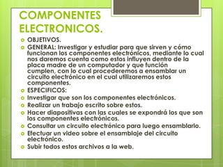El documento presenta una lista de componentes electrónicos básicos como resistencias, condensadores, diodos y transistores. Explica brevemente qué son y cómo funcionan cada uno de estos componentes. También describe otros dispositivos como bobinas, fusibles, relés y circuitos integrados. El objetivo es investigar y estudiar estos componentes para comprender cómo influyen en las placas madre de los computadores.