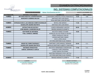 Este documento presenta el horario de exámenes extraordinarios de varias materias del programa de Ingeniería en Sistemas Computacionales para el cuatrimestre de agosto a diciembre de 2012. Se enumeran 4 materias con sus respectivos alumnos, aplicadores, hora y lugar de aplicación para el martes 18 de diciembre.
