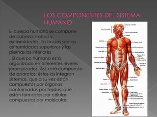 El cuerpo humano está compuesto de cabeza, tronco y extremidades. Está organizado en diferentes niveles jerárquicos, incluyendo aparatos, sistemas, órganos, tejidos y células. El sistema circulatorio está compuesto por el sistema cardiovascular, que conduce la sangre, y el sistema linfático, que conduce la linfa hacia el corazón.