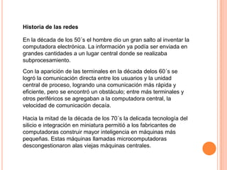El documento resume la historia y los tipos de redes. En la década de 1950 se inventó la computadora electrónica y en la década de 1960 se logró la comunicación directa entre usuarios y la computadora central. En la década de 1970 se construyeron microcomputadoras más pequeñas. Las redes locales (LAN) conectan computadoras en una oficina, las redes metropolitanas (MAN) permiten el acceso remoto a la LAN, y las redes amplias (WAN) se extienden a larga distancia usando cableado telefónico.
