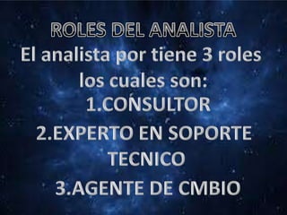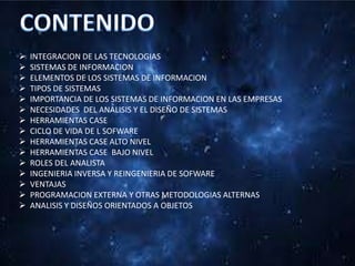 El documento trata sobre los sistemas de información y su análisis y diseño. Explica los elementos clave de los sistemas de información, diferentes tipos de sistemas, la importancia de los sistemas de información para las empresas, y herramientas como CASE y el ciclo de vida del software. También cubre temas como el análisis de requisitos, el diseño orientado a objetos, y el rol del analista de sistemas.