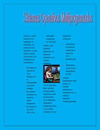 Un sistema operativo es un programa que gestiona los procesos básicos de un sistema informático y permite la ejecución de otras operaciones. Un sistema operativo incluye un núcleo que gestiona los recursos del hardware y alivia a los programadores de aplicaciones de tener que tratar con estos detalles. Los sistemas operativos multiprogramados administran la memoria, gestionan el uso de la CPU y los dispositivos de entrada/salida, y crean y destruyen procesos.