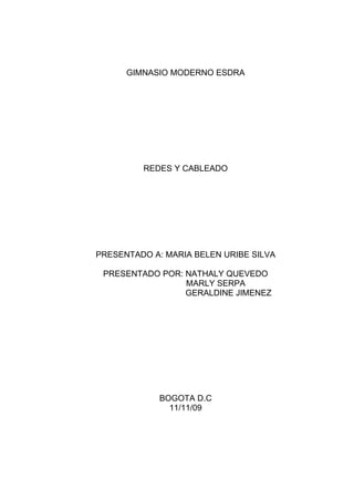 Este documento presenta información sobre la red de cableado estructurado que se instalará en el gimnasio moderno Esdras. Explica que el cableado estructurado consiste en tender cables en el interior de un edificio para implantar una red de área local, respetando estándares para lograr flexibilidad, crecimiento y facilidad de administración. También describe consideraciones de diseño como la segmentación del tráfico, longitud máxima de segmentos y presencia de interferencias electromagnéticas. El objetivo es tender cables en cada planta y conect