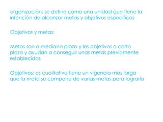 El documento habla sobre los sistemas de información y la organización de empresas. Define objetivos, metas y factores organizacionales como el factor humano y externo. Describe estructuras organizacionales como sistemas de autoridad, comunicación y procesos de decisión. Explica tipos de departamentalización como funcional, por producto, geográfica y por clientes. Finalmente, detalla características de líderes y enfoques de gestión como clásico, por objetivos y humanístico.