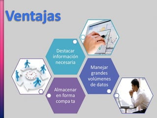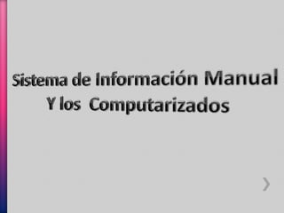 Un sistema informático está compuesto de hardware, software, datos e información y recursos humanos. El hardware incluye componentes físicos como computadoras, impresoras y monitores, mientras que el software son los programas que funcionan en el hardware. Los sistemas informáticos utilizan estos componentes junto con datos e información para procesar y almacenar información de manera computarizada en lugar de manual.