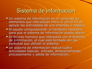 Un sistema de información es un conjunto de elementos que interactúan para apoyar las actividades de un negocio e incluye hardware, software y personas. Realiza cuatro actividades básicas: entrada, almacenamiento, procesamiento y salida de información. Los sistemas han evolucionado a través de cuatro generaciones paralelas al desarrollo del hardware, desde sistemas por lotes hasta sistemas de tiempo compartido, modos múltiples y acceso a distancia a través de redes.