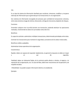 El documento describe diferentes tipos de sistemas de información, incluyendo sistemas de procesamiento de transacciones, sistemas de información gerencial, sistemas de soporte a la decisión, sistemas expertos y sistemas de planificación de recursos empresariales. Define cada sistema y proporciona ejemplos de sus aplicaciones.