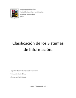 El documento describe diferentes tipos de sistemas de información, incluyendo sistemas de procesamiento de transacciones, sistemas de gestión del conocimiento, sistemas de información gerencial, sistemas de soporte a la decisión, sistemas expertos, sistemas ERP y sistemas de automatización de oficinas. Define cada tipo de sistema y explica sus características y usos.