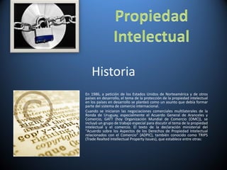 La propiedad intelectual se refiere a los derechos sobre creaciones del intelecto como obras literarias, artísticas, invenciones científicas, tecnológicas, marcas e indicaciones geográficas. Se clasifica en propiedad industrial como patentes y marcas, y derechos de autor sobre obras creativas. Su protección se ha vuelto importante para el comercio internacional a través de acuerdos como el ADPIC de la OMC.